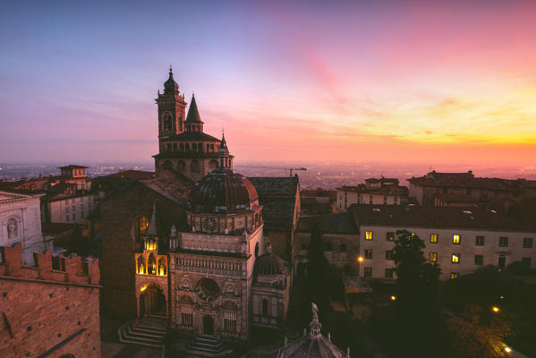 Santa Maria Maggiore and Chapel Colleoni view from Campanone tower at sunset in Autumn season, Bergamo, Bergamo province, Lombardy district, Italy.