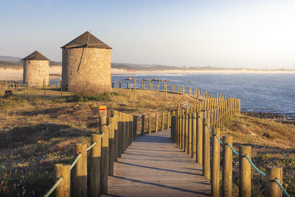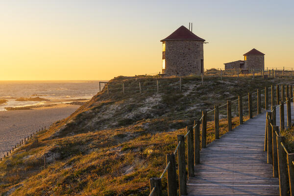 A tourist walks over wooden walkay around Apulia Windmills at sunset, Apulia, Esposende, Braga, Norte, Portugal, Iberian Peninsula, Western Europe (MR)