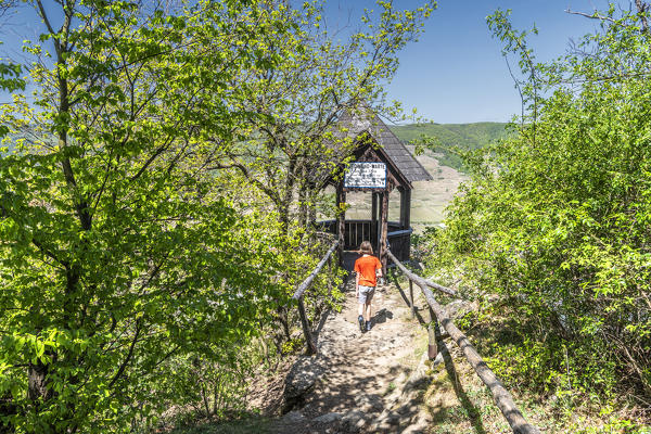 Mautern an der Donau, Bergern im Dunkelsteinerwald, district of Krems, Wachau, Lower Austria, Austria, Europe. Children admiring the panoramic view from the Ferdinand-Warte to the Danube valley with the villages of Unterloiben, Mautern an der Donau and Krems an der Donau (MR)