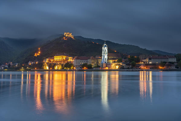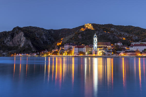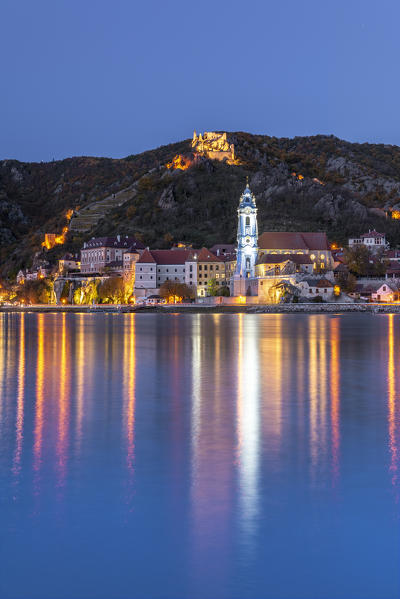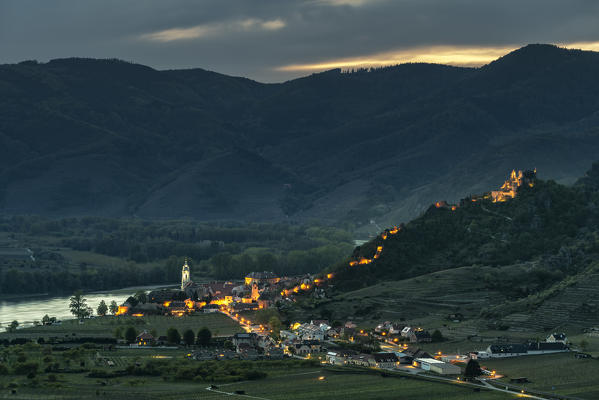 Mautern an der Donau, Bergern im Dunkelsteinerwald, district of Krems, Wachau, Lower Austria, Austria, Europe. The villages of Stein an der Donau and Krems an der Donau at dusk