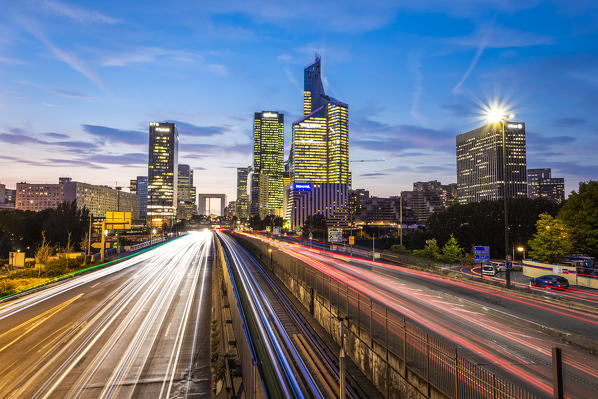 Arc de la Défence and La Défence Skyscaper during the night and cars’s lights (Paris, Ile-de-France, France, Europe)