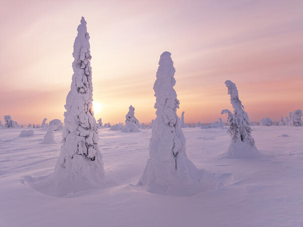 magical arctic light envelops the beautiful snow-covered trees in Riisitunturi national park during a cold winter day, Riisitunturi, Posio, Finland, Europe