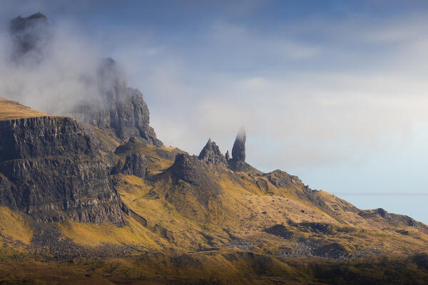 Aerial view of a tourist at Old Man of Storr during sunrise, Isle of Skye, Inner Hebrides, Trotternish peninsula, Highlands, Scotland, United Kingdom