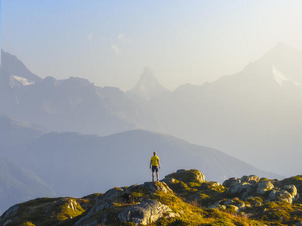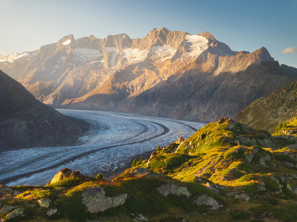 A trekker with his illuminated tent observes Aletsch Glacier under a starry sky in summer, Riederalp, Canton of Valais, Oriental Raron, Switzerland, Western Europe