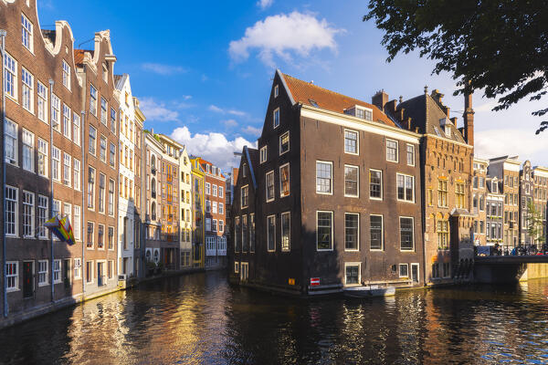 A tourist observes sunset in front of a typical house in Zaanse Schans during summer, Zaandam, Zaanstad, Netherlands, North Holland, Western Europe
