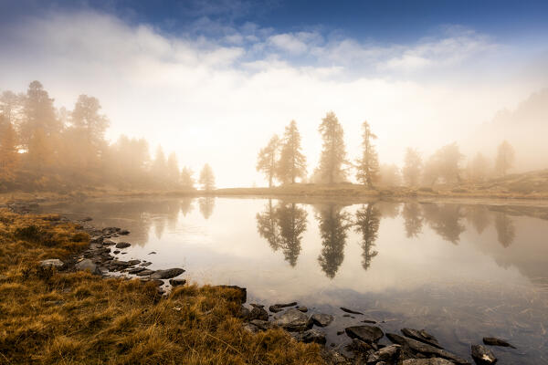 Autumn colors at Zocche lake, Parco delle Orobie Valtellinesi, Valtellina, Lombardy, ITaly, Europe.
