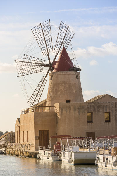 Salt pans in front of Infersa windmill on the coast connecting Marsala to Trapani, Trapani province,Sicily,Italy