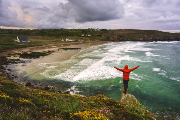 Photographer in Trespasses Bay in Cléden-Cap-Sizun at Dawn, Finistère, Bretagne, France.