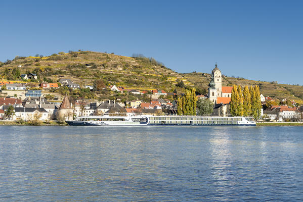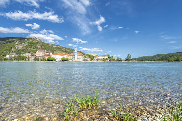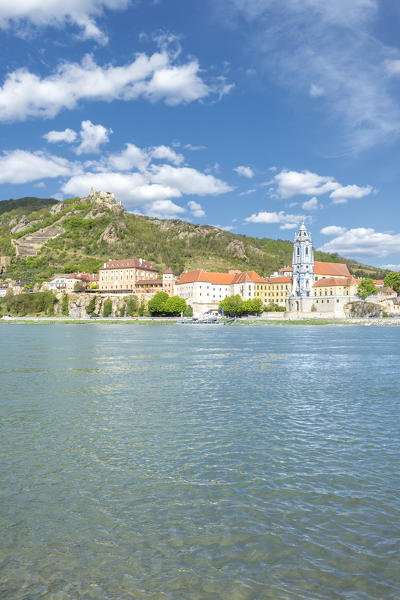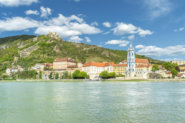 Duernstein, Wachau, Waldviertel, district of Krems, Lower Austria, Austria, Europe. Duernstein with the collegiate church and the castle ruins