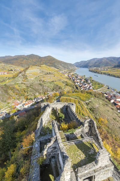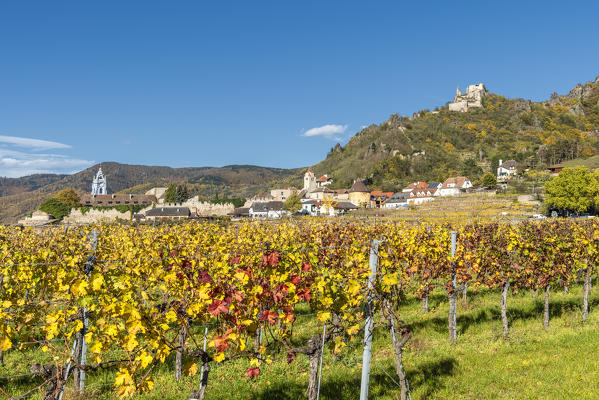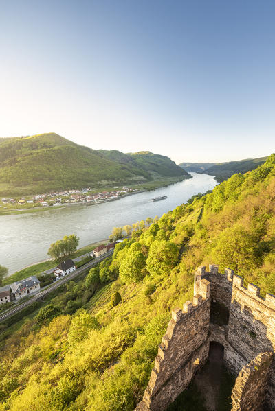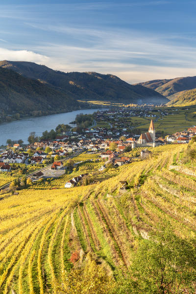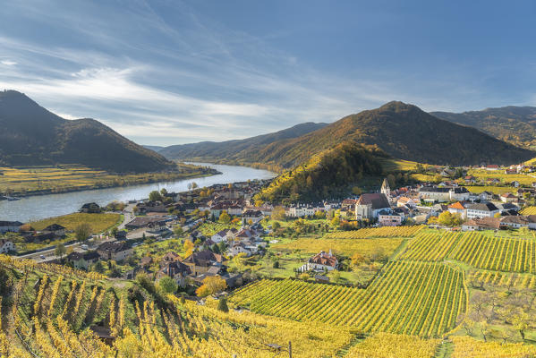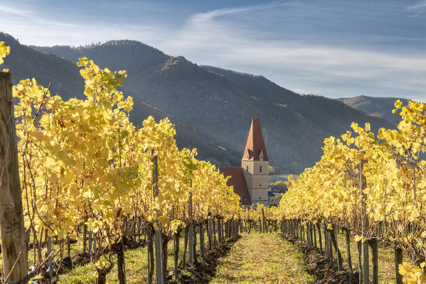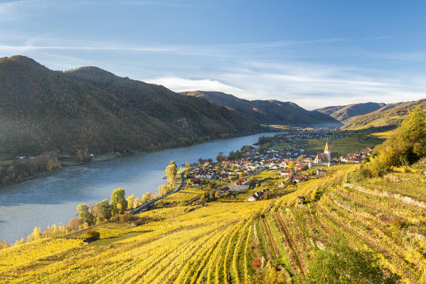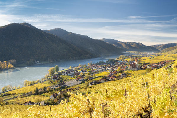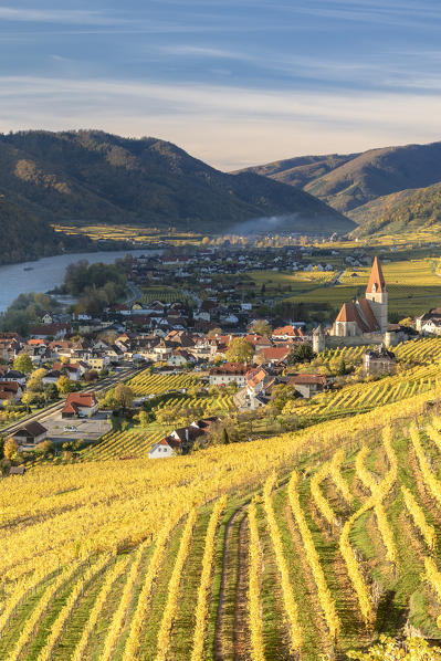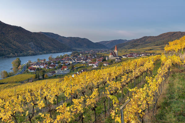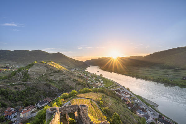 Weissenkirchen in der Wachau, Wachau, Waldviertel, district of Krems, Lower Austria, Austria, Europe. Sunrise in the vineyards near Weissenkirchen in der Wachau, view to the Danube river and the villages of Rossatz and Dürnstein