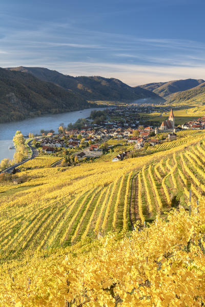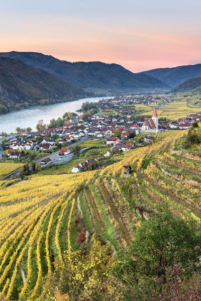 Weissenkirchen in der Wachau, Wachau, Waldviertel, district of Krems, Lower Austria, Austria, Europe. Sunrise in the vineyards near Weissenkirchen in der Wachau, view to the Danube river and the villages  of Rossatz and Dürnstein