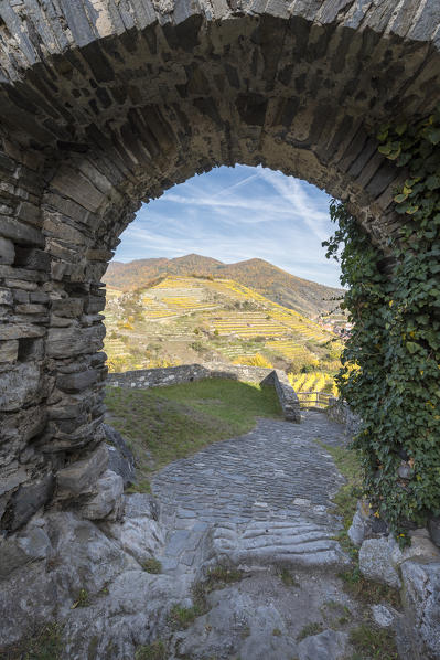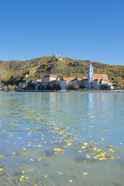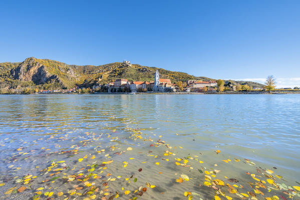 Spitz an der Donau, Wachau, Waldviertel, district of Krems, Lower Austria, Austria, Europe. View from the ruins of Hinterhaus castle to the Danube river and the village of Spitz an der Donau